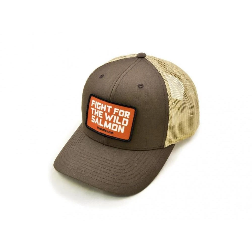 This is our brown/tan American made premium cotton twill, pre-curved trucker hat with ‘Fight for the Wild Salmon’ patch. Support us in the fight, we give back to the organizations Redd Villaksen and NASF!